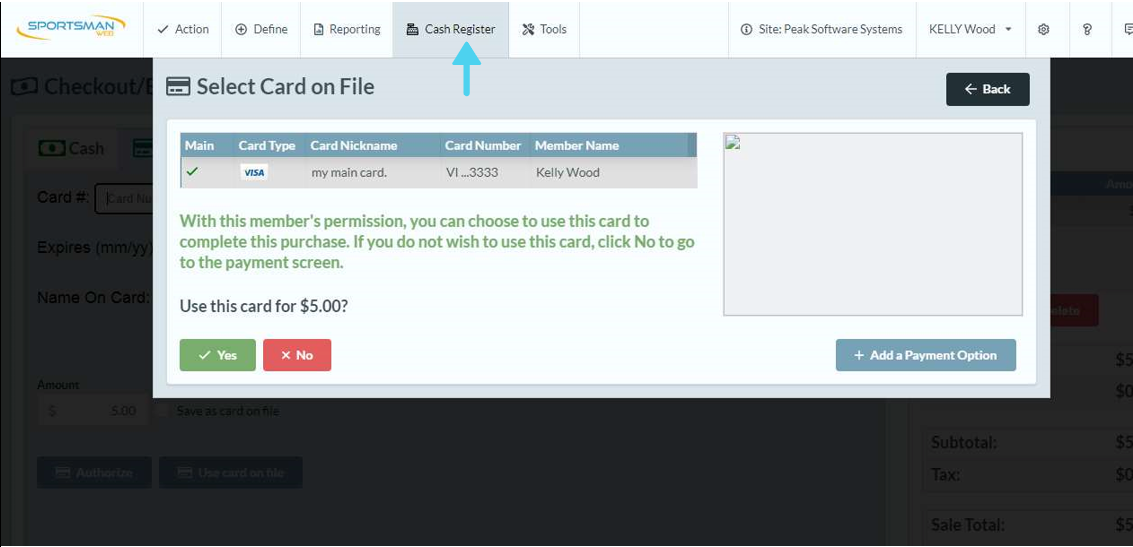 This document describes the setup and usage of the Card On File (COF) functionality available for the cash register in Sportsman Web. The Sportsman Development team has committed to make Card on File programming available within ActivityReg in the coming months. When that enhancement is complete, your Patrons can add and manage their credit cards via their log in and select which card to use in the ActivityReg cash register payment options screen. At this time however, front desk staff will be entering card numbers and usage options for customers (in person or over the phone).