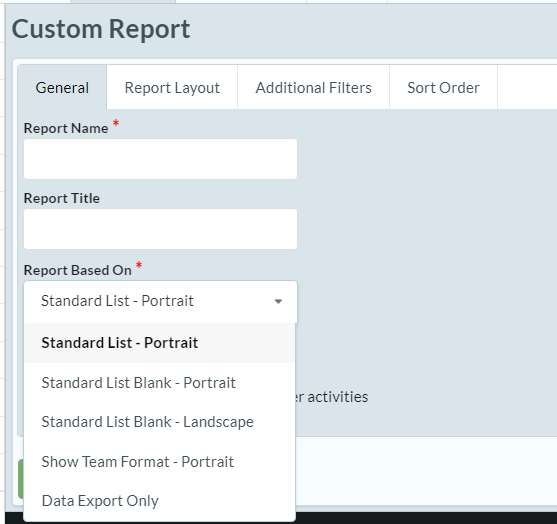 Choose the style and data to base the report on: "Report Based On." You'll see several options for the report orientation and data set to use for your report. If you want to create a report from scratch without any of the default data on the report, you'll need to select an orientation that is "Blank."