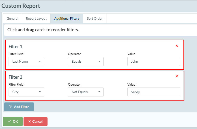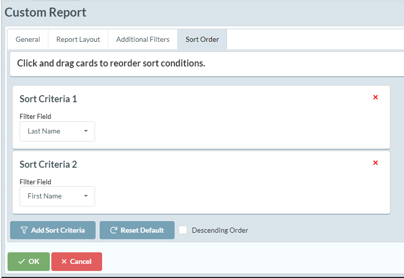 The sort order will give priority to the first criteria set. If I add another sort criteria for the first name, "Sort Criteria 2," set the "Filter Field" to "First Name." It will sort the report by last name, then first name.
