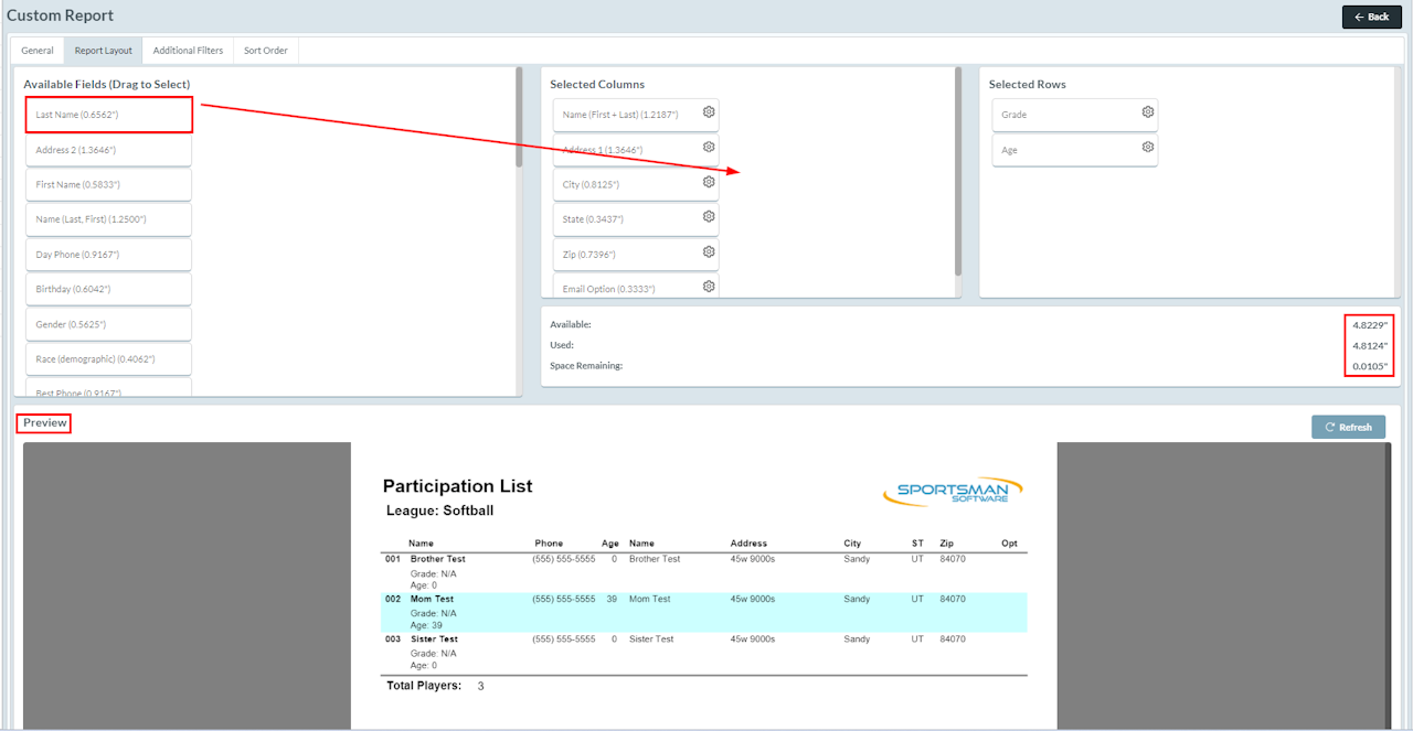 This is where you will choose which data to display on your report. Drag and drop the "Available Fields" into the "Selected Columns" or "Selected Rows." The report's Available, Used, and Remaining space (report width) is listed below the columns and rows. Each "Available Field" lists the space it'll consume in parentheses next to the field's name if the field is used as a "Selected Column."