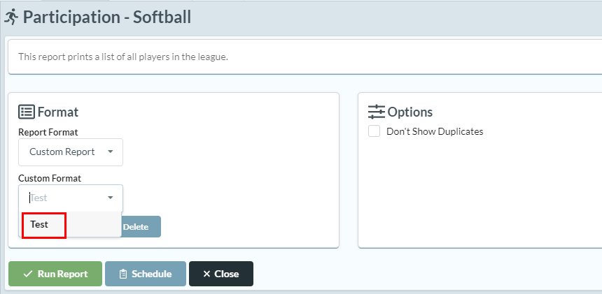 After you've created a custom report, select your "Custom Format" and click [Run Report].