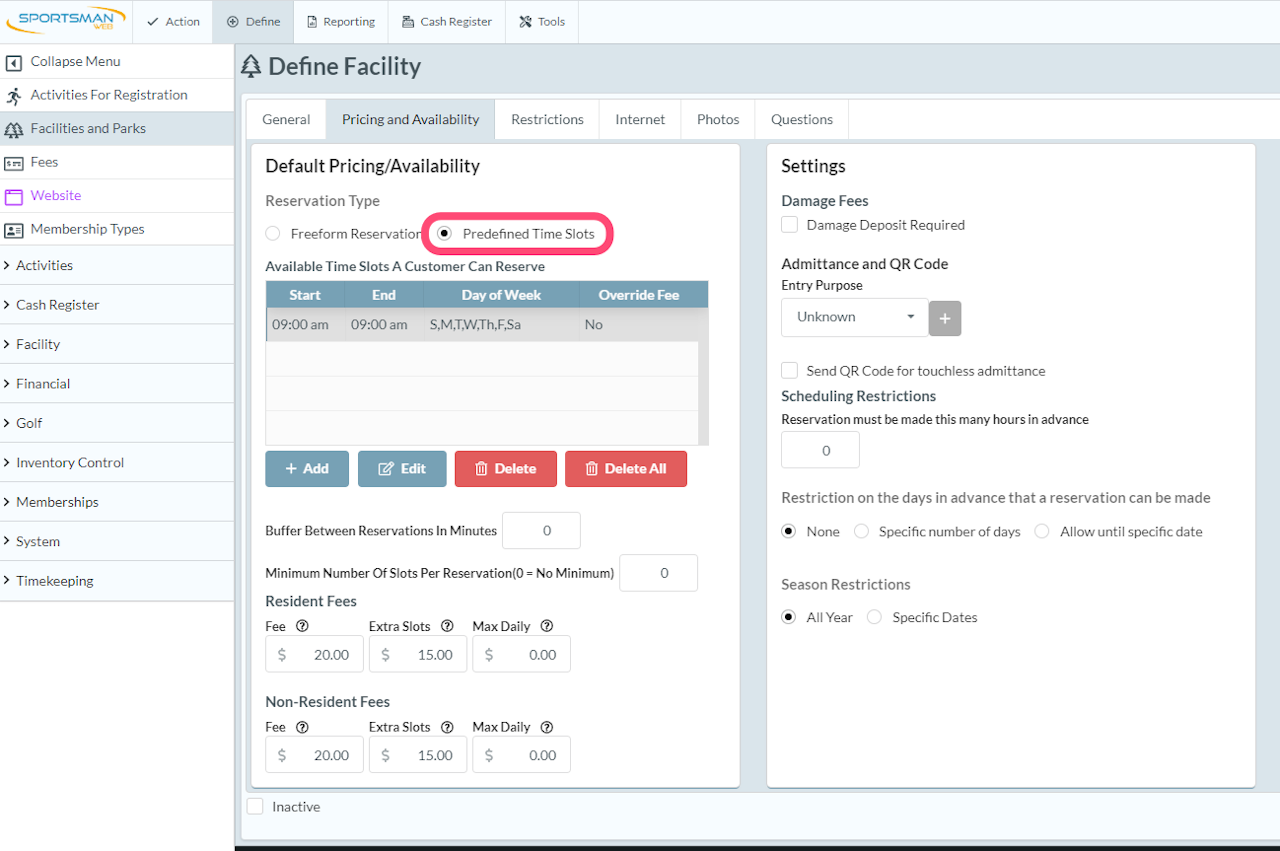 In this example, "North Campground" is a "Top Level Facility" configured as a "Resource". To add the campsites, click the campground in your facility tree to highlight it and "+Add New Under Selected Item". When defining your campsite, you must pick "Predefined Time Slot" as your "Reservation Type" for all campsites.