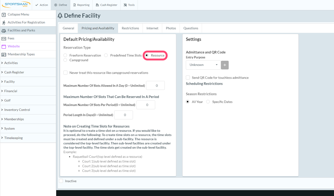 The "Resource" view is designed to make the reservation process for campgrounds easier. When you are defining campgrounds in Sportsman, but you only want to display timeslots for the campsites, you can set up your campground as a "Resource".
