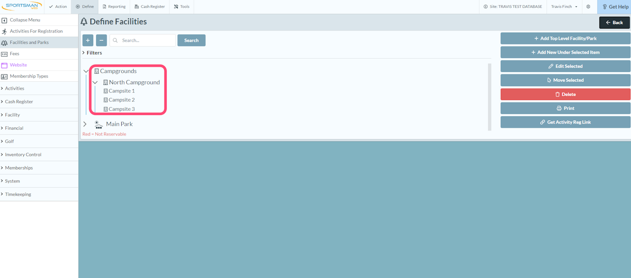 In this example, "North Campground" is a "Top Level Facility" configured as a "Resource". To add the campsites, click the campground in your facility tree to highlight it and "+Add New Under Selected Item". When defining your campsite, you must pick "Predefined Time Slot" as your "Reservation Type" for all campsites.