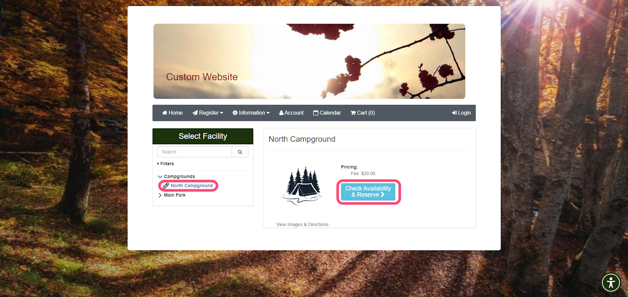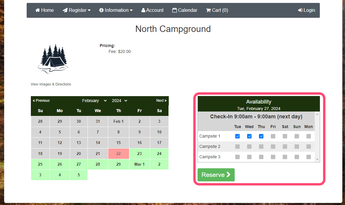 Since we set up this campground as a Resource, you'll notice the campsites aren't cluttering up your facility list. Instead, when you click "Check Availability & Reserve", your campsites will now display in a list and you can check the box for the timeslot you want to reserve.