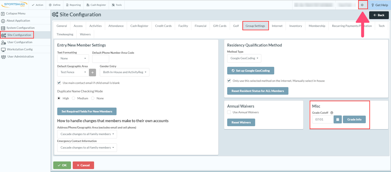 Click the cog (gear icon) in the top right corner of Sportsman. Select [Site Configuration] > [Group Settings] then you'll see a "Misc" section where you can set your grade cutoff date and view [Grade Info]