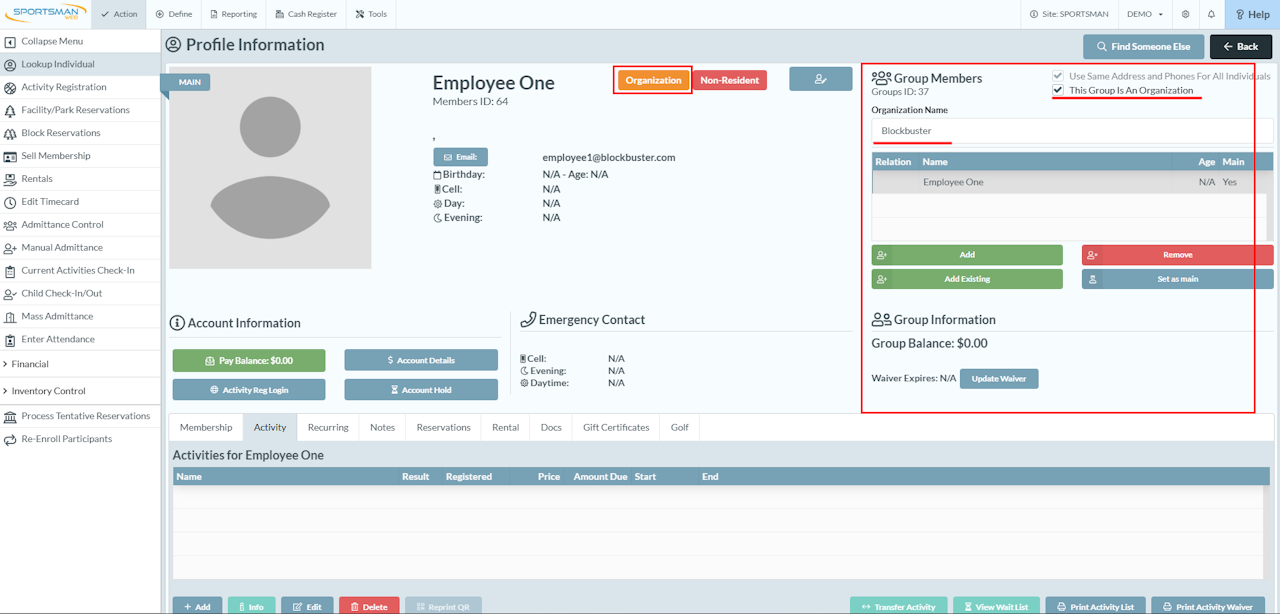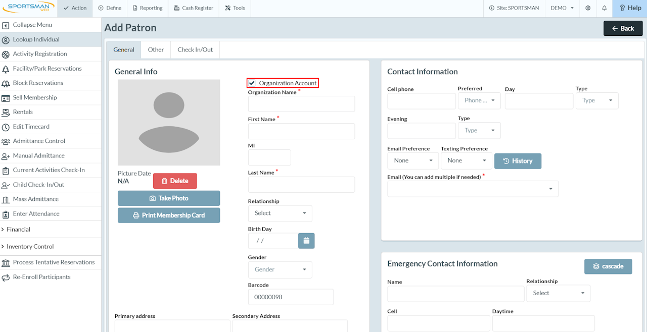 To change an existing patron account to an organization account, check the box "This Group is an Organization" and enter the Organization Name.