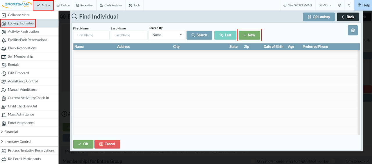 In Sportsman Web click the "Action" tab, then "Lookup Individual". On the "Find Individual" window click the [+ New] button to create a new account. Reference Image 1