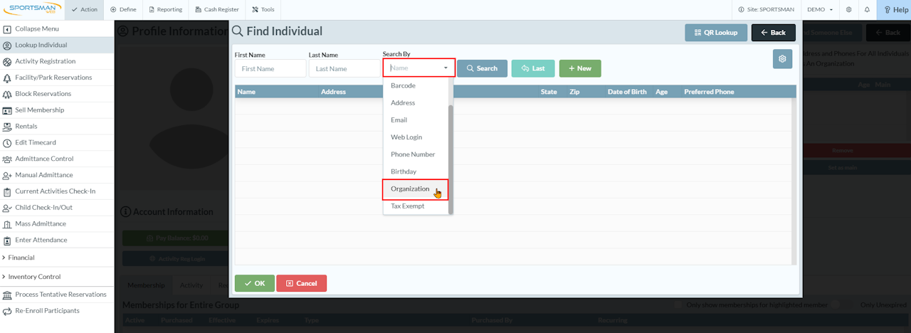 To find an organization, use the same "Lookup Individual" function you use to search for patron accounts. You can search for a contact at the organization, or change your "Search By" filter to "Organization" and search for the organization's name. Reference Image 1