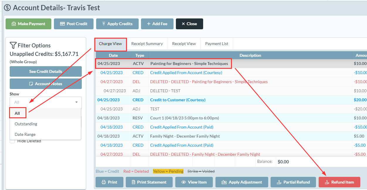 From the "Charge View" show "All" in the filters and highlight the transaction you want to refund.
