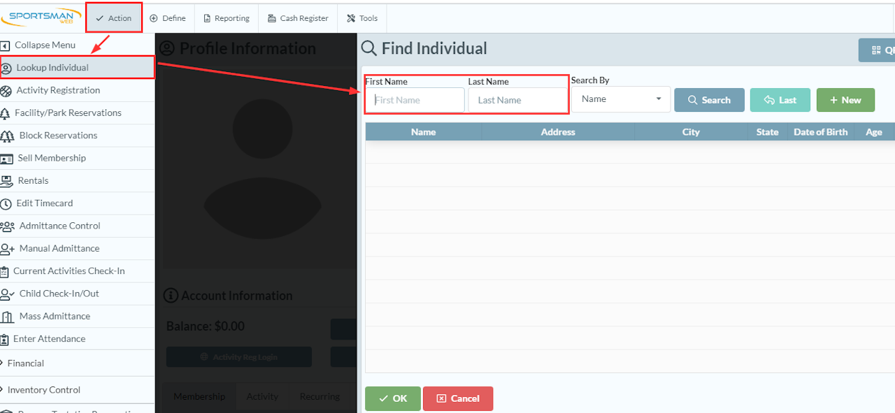 Use the "Lookup Individual" Action to search the Patron Account. Then select "Account Details" to view the Patron's financial history.