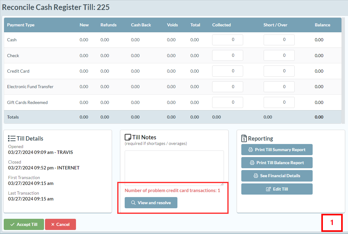 While reconciling your tills Sportsman will notify you of any potential issues with the credit card transactions that were processed in a till.