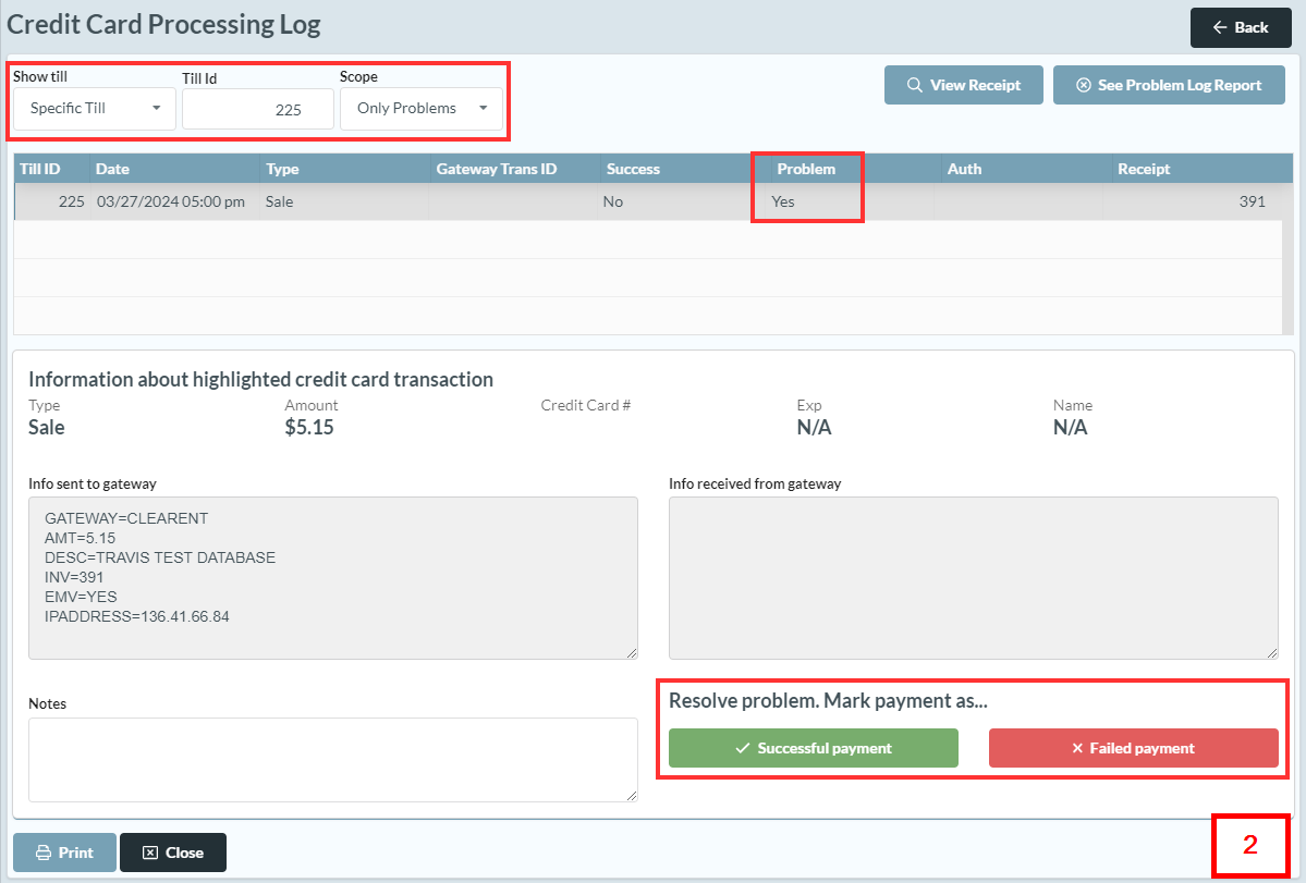 When accessed using the [View and Resolve] button in your till, the Credit Card Processing Log will be filtered to show "Only Problems" for the till you were reconciling.