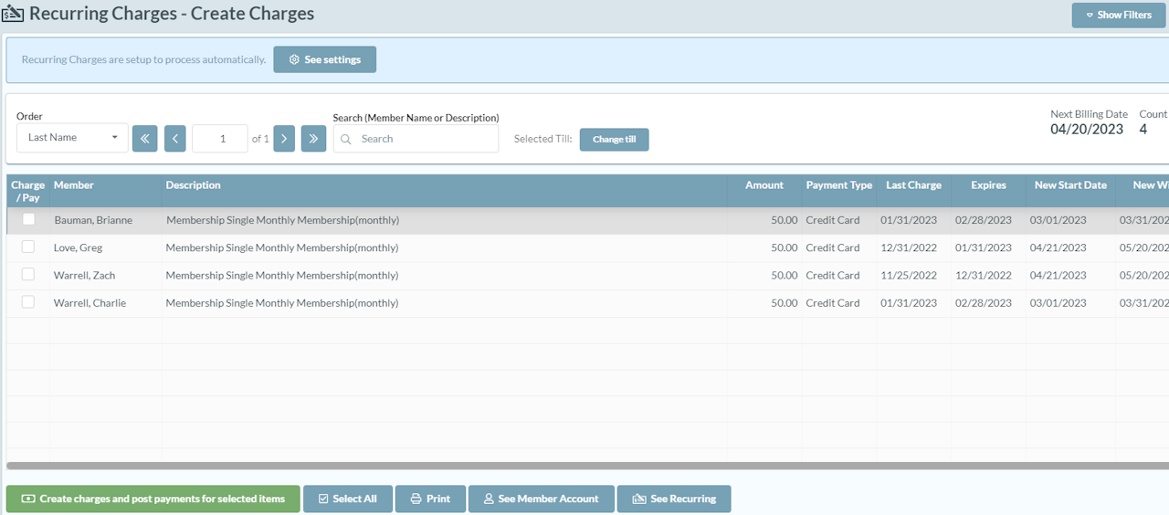 Automatic recurring charge processing allows you to set parameters to charge your recurring members on a monthly schedule automatically. You can enable this setting as long as a card-on-file functionality is turned on. This process will automatically charge the card on file, and send notifications during the process such as before the payment, upon a successful payment, and when a payment is failed. Please give customer support a call at (801) 572-3570 option 2 to first help you set this up.