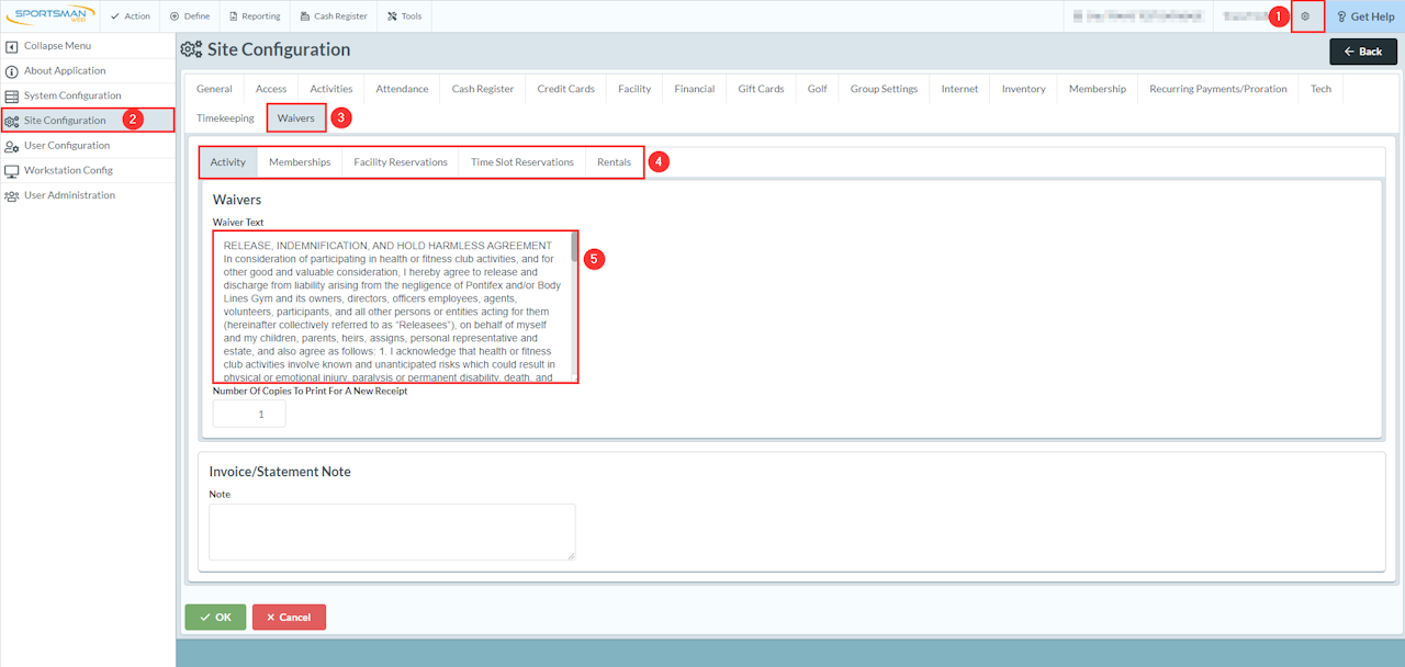 Navigate to your "Site Configuration" settings. Click the gear icon in the top right corner of Sportsman, on the left navigation menu, click [Site Configuration], then select the [Waivers] tab.