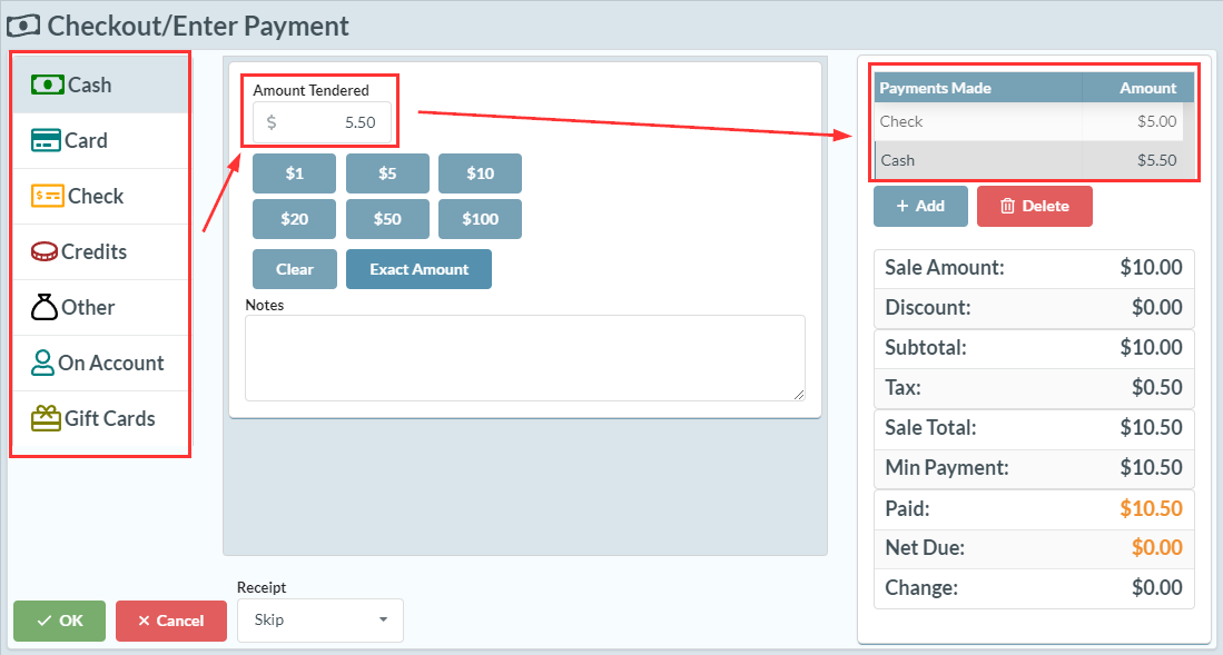 Select your second payment method and set the amount for the second payment. You'll see a breakdown of each payment in the top right corner under "Payments Made". Once you've confirmed the correct amount for each payment method, click [OK] to complete the transaction.