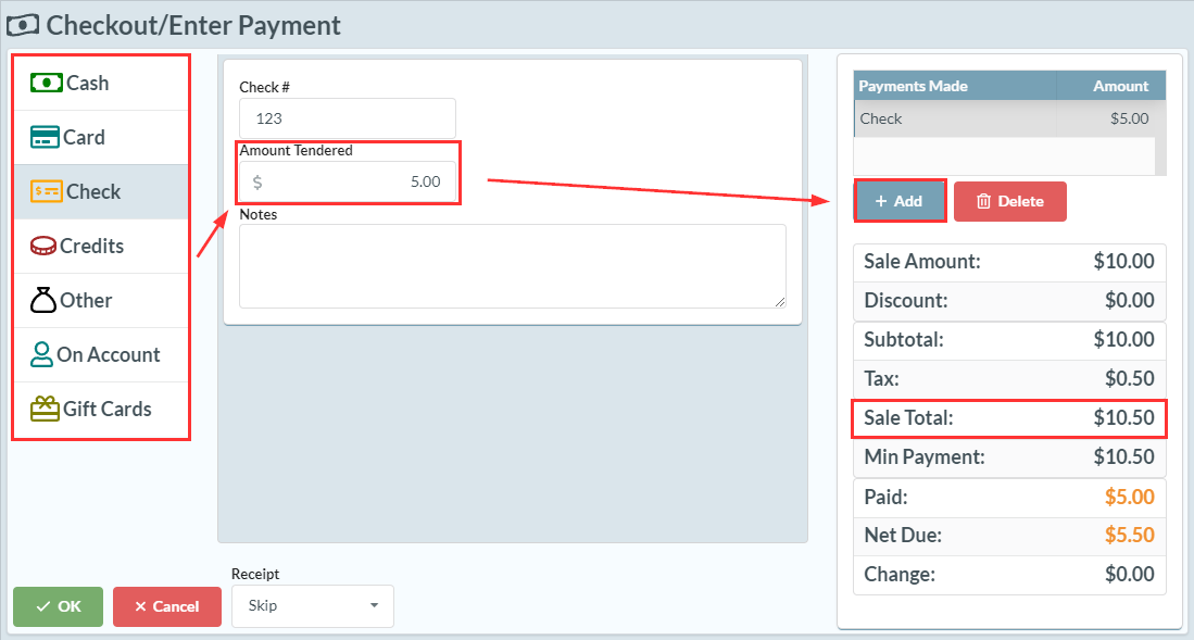 Once an item has been added to your cart and you've clicked the [Checkout] button inside the cash register, select the first payment method and set the amount for the first payment. After setting the amount for the first payment click [+ Add] in the top right corner. This will add your payment for the amount specified and allow you to select a second payment method